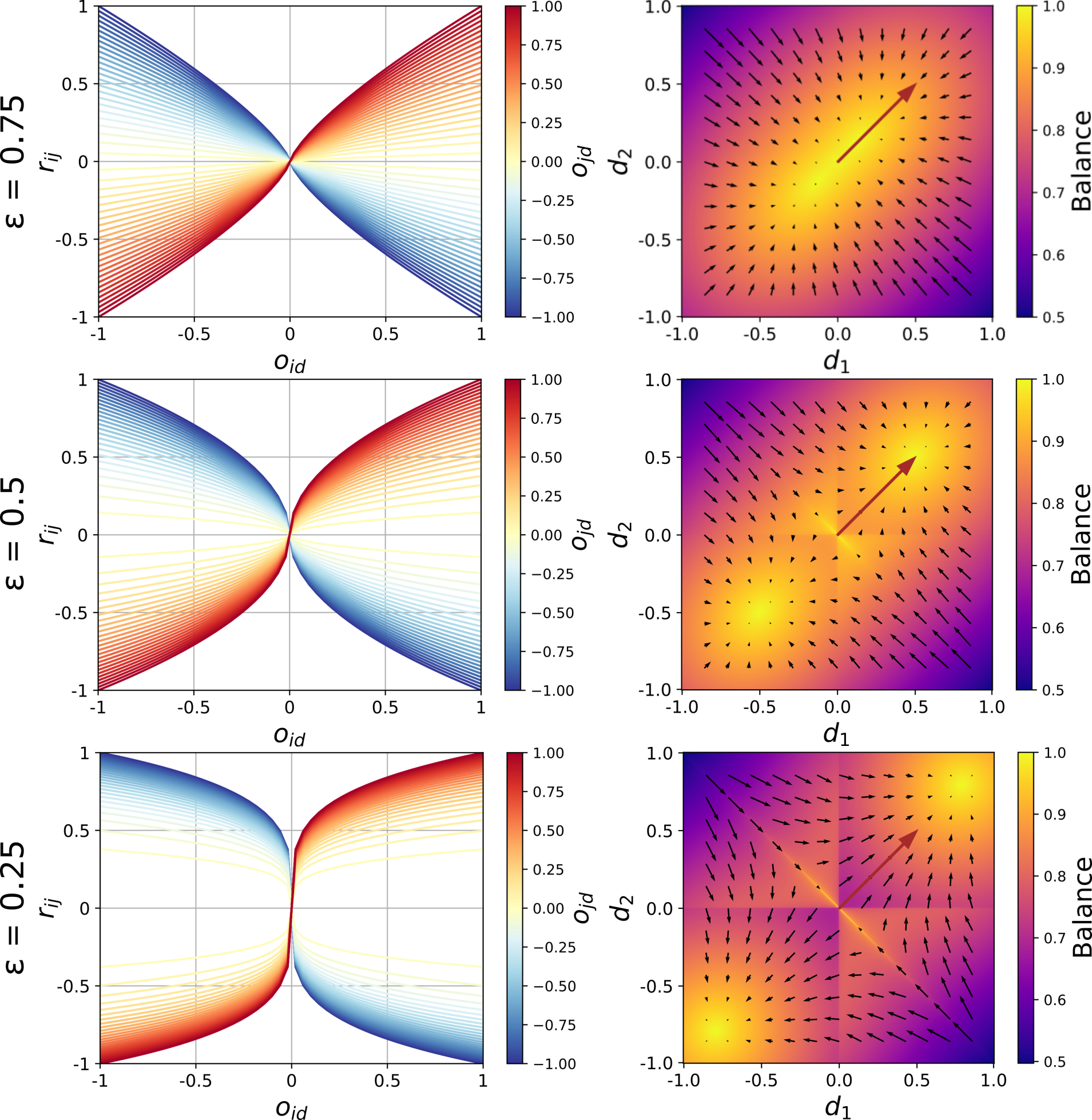 The vector field plots in the right column of Figure 2 illustrate the process of opinion exchange for three different values of the equanimity parameter \(\epsilon\). The axes of the plots span a 2-dimensional opinion space. The red arrow corresponds to the opinion vector \(\mathbf{o}_{j} = [.5,.5]\). The bases of the black arrows correspond to the initial opinion vectors of various individuals \(i = 1,...,N\). The length and direction of the black arrows represent their change in issue position after an interaction with \(j\) (the step size parameter is set to \(\alpha=0.15\) here). The background color represents the level of balance in each region of the opinion space. We define the balance of \(i\) in its interaction with \(j\) as the inverse of the normalized Euclidean distance (\(\text{dist}_e\)) of \(i\)’s opinion vector from its maximally balanced vector: