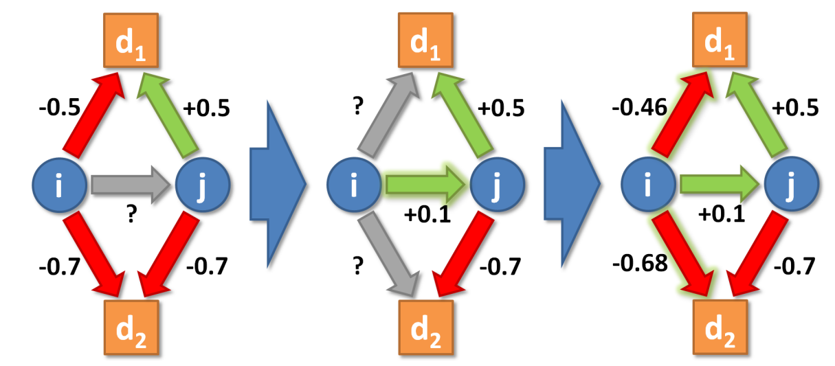 But this is only the first step: Once \(r_{ij}\) is obtained, it forms the basis of the two \(i,j,d\) triads, which are not necessarily balanced. Thus, in the second step, \(i\) will adapt its issue positions in a way that makes them more consistent with its attitude towards \(j\). The pressure to adapt is especially high for the \(i,j,d_1\) triad in our example, since this triad is now very unbalanced: \(i\) and \(j\) disagree on \(d_1\), even though they have a positive relationship.