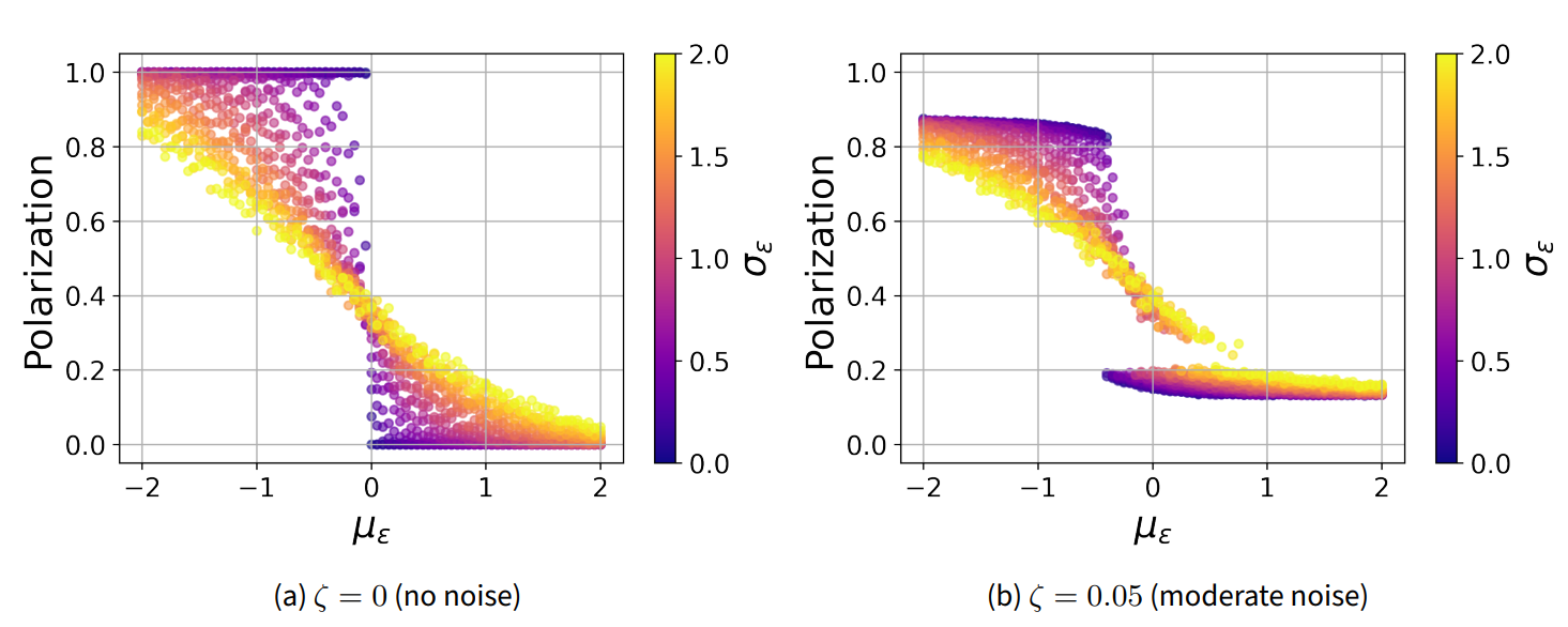 Figure 4 b shows the effects of noise on the model behavior. First, we notice that the model can no longer reach full polarization or complete consensus. These idealized opinion configurations are disturbed by the influence of noise. For models with uniform equanimity parameter (\(\sigma_\epsilon=0\)), there is still a sudden drop in polarization. However, this drop now happens at a slightly lower value of mean equanimity (around \(\mu_\epsilon=-0.5\)).