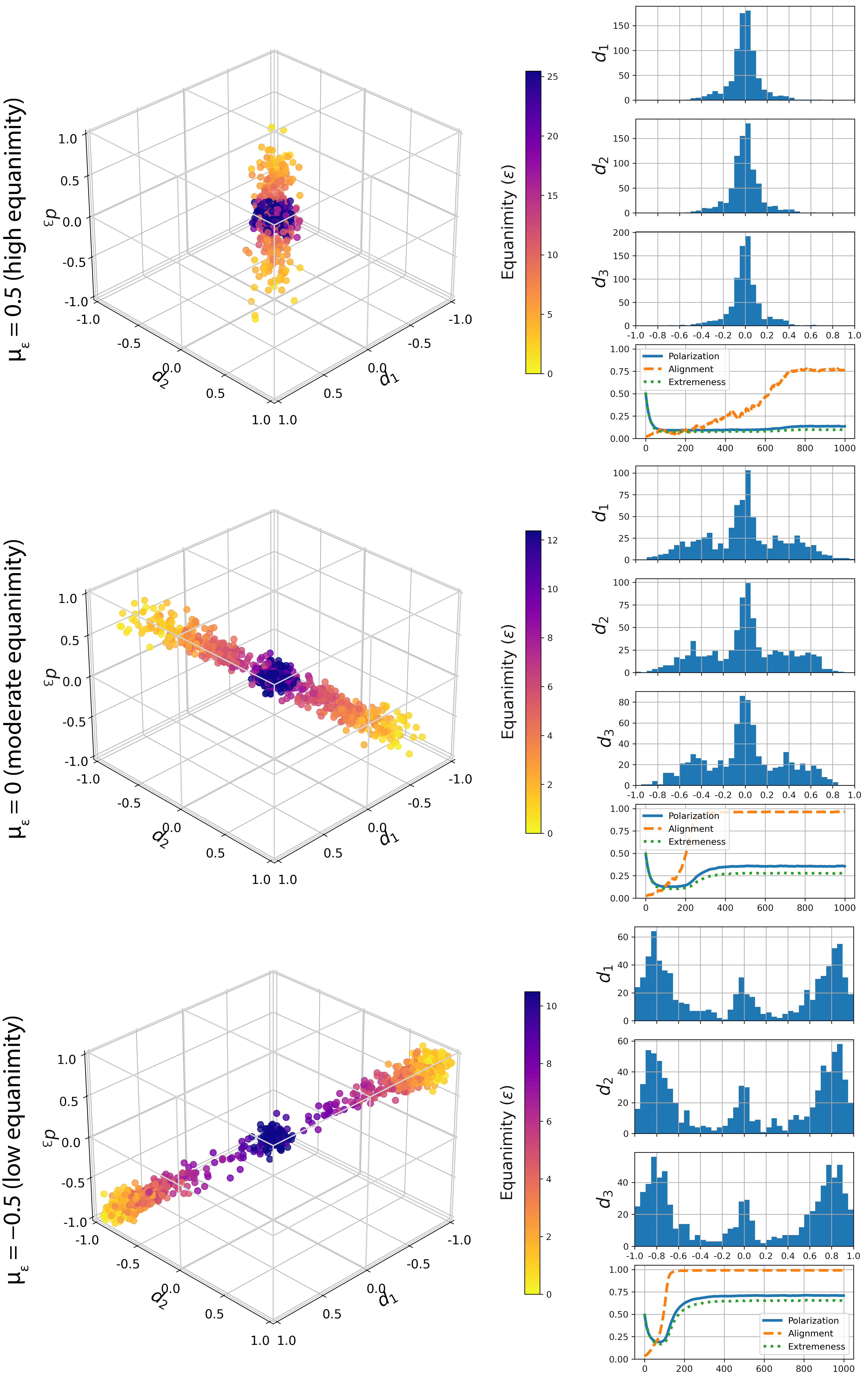 Figure 5 illustrates three idiosyncratic model runs. Each of these models has been run with our usual settings (see above), \(D=3\) and \(\sigma_\epsilon=1\). The only difference between them is the mean of the agent-specific equanimity distribution (\(\mu_\epsilon\)), which results in very different degrees of polarization: \(0.14\) for the model with \(\mu_\epsilon=0.5\) (top), \(0.35\) for the model with \(\mu_\epsilon=0\) (middle), and \(0.71\) for model with \(\mu_\epsilon=-0.5\) (bottom).
