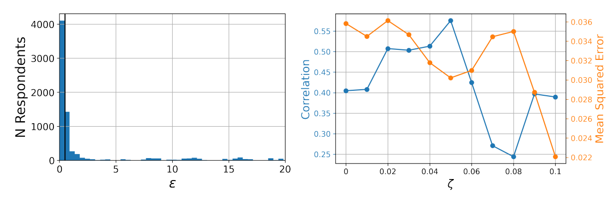 To calibrate our model, we estimate individual \(\epsilon\)-parameters based on the same ANES data which we already investigated in the last section. Our estimation process minimizes the squared error, i.e. the squared distance of the SGM based prediction and the empirically measured thermometer rating. For example, if a respondent has a more extreme attitude towards a candidate than predicted with \(\epsilon = 0.5\), we adjust \(\epsilon\) to a lower value until we have minimized the squared error. Fortunately, this problem is convex, so we use a gradient descent algorithm to find the optimal value for each respondent. We apply this algorithm to each of the twelve ANES survey waves. Figure 7 (left) shows the distribution of \(\epsilon\)-values for the 2016 wave. Each of the resulting distributions of individual \(\epsilon\)-values is extremely skewed: While the median ranges between \(0.32\) and \(0.6\), the mean is between \(2.42\) and \(4.85\). The minima are always close to zero, whereas the maximum values can go as high as \(\epsilon=45.1\). We thus have distributions of individual \(\epsilon\) that are asymmetric and long-tailed. As explained in Section 4, we emulate these skewed distributions in our model by drawing \(\epsilon\) values from a log-normal distribution.