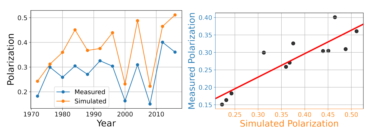 Figure 8 gives a visual impression of the concordance between Polarization measured on ANES data, and simulated with our Weighted Balance Model with \(\zeta=0.05\). While there is a difference in the level of polarization throughout the time series, with simulated Polarization values always being higher than empirical Polarization, the trajectories of simulated and empirical Polarization are very similar. Thus, the WBT model is able to explain trends in Polarization based only on changes in the distribution of the individual \(\epsilon\) parameter.