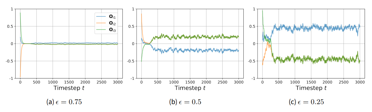 At \(t=0\), all three agents start with random values of their three issue positions \(\mathbf{O}_{i1}\), \(\mathbf{O}_{i2}\), \(\mathbf{O}_{i3}\). Over the next 100 time steps, they converge to the center of the opinion space. As explained in Section 5, in this de-polarized phase, the agents self-organize into an emergent ideological spectrum. We can see this happening in Figure 9, with some lines crossing the x-axis.