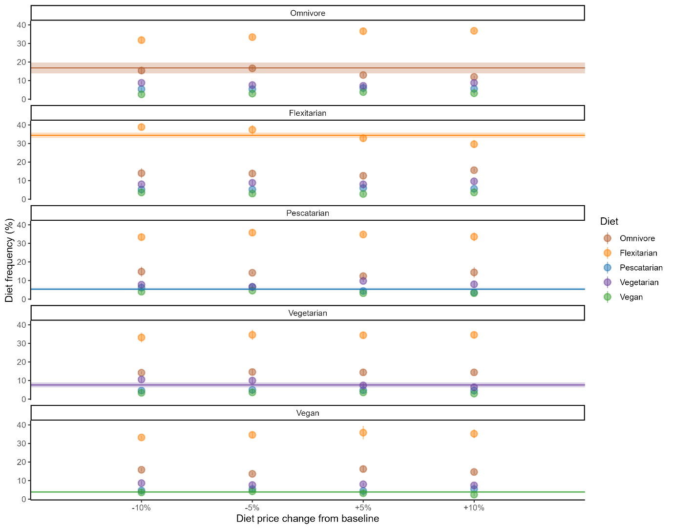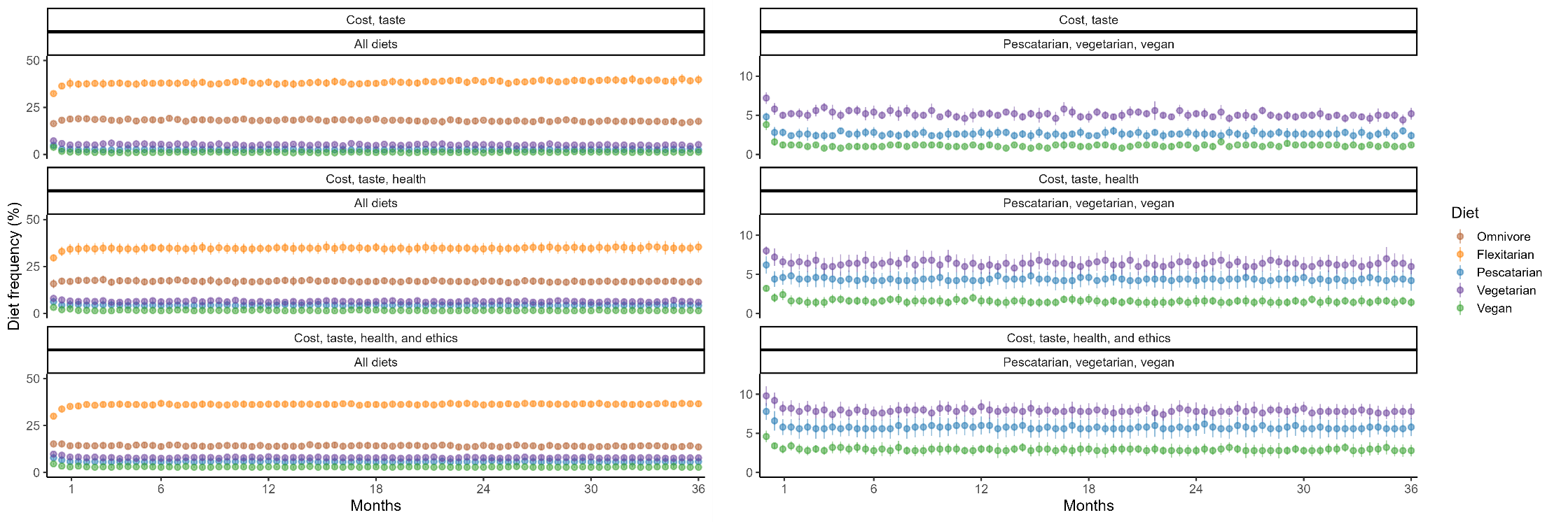 On a more contextual level, constraints such as cost can prevent consumers from making choices in line with their values. The consumers in the model who were financially limited to the least expensive diet typically perceived their diets as less ethical than healthy, despite having similar motivations for ethics and health, suggesting they may have chosen another diet that they considered more ethical (but equally healthy) if cost were not a concern. Moreover, when prices of flexitarian and vegetarian diets decreased, the popularity of these diets increased. While the increase was not large, this indicates that alleviating cost constraints does facilitate consumers choosing diets in line with their motivations. While other aspects of food environment and consumption, such as accessibility, and time and knowledge required for preparation, were not modeled here, these can also be considerable barriers to change. Policy aimed at making switching to a sustainable diet as feasible as possible across a range of aspects will thus increase the likelihood that individuals are able to make this change (Trudel 2019).