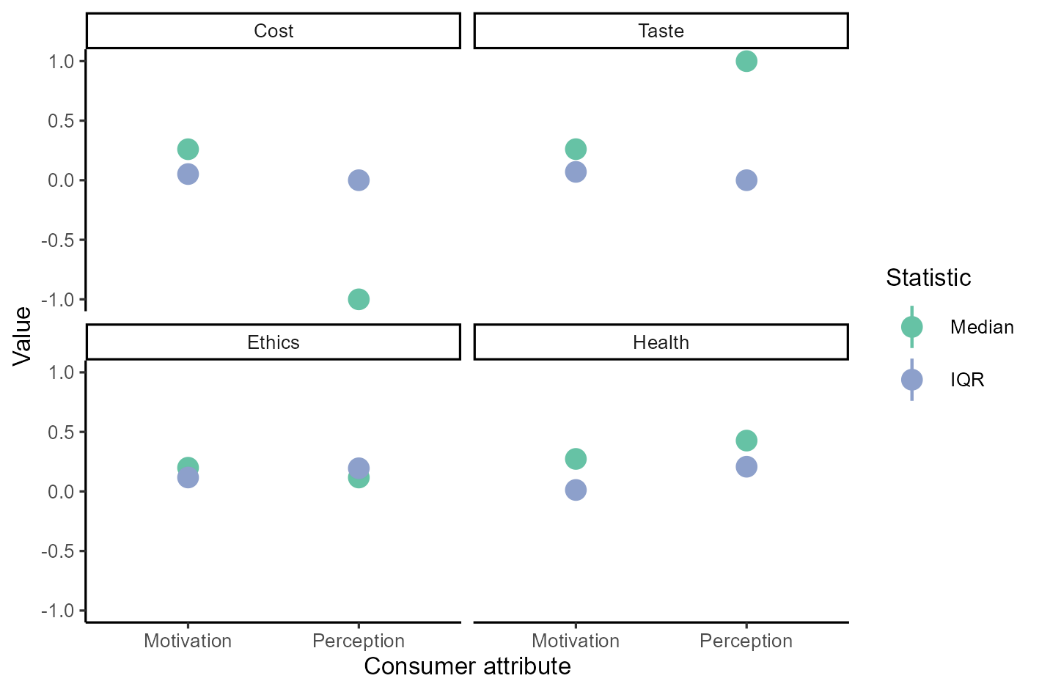 First, perceptions of diet impacts and attributes (such as environmental impact or healthiness) can be inaccurate. This can cause a consumer to behave in a way that they perceive as consistent with their values, but not consistent when viewed from the outside. For example, consumers in the model who chose omnivore or flexitarian diets typically had lower ethical motivations than consumers who chose vegetarian or vegan diets (Figure 7), with pescatarians showing a wider range of ethics motivations. These consumers typically still perceived their diets as approximately neutral (omnivore) or positive (flexitarian, pescatarian). This is consistent with that of the general Dutch population, where there is a limited understanding of the environmental impact of meat (Geurts et al. 2017). While flexitarian and pescatarian diets can be made healthier and more sustainable by limiting animal protein (Sijtsema et al. 2021), it is still inaccurate to perceive them as similar in sustainability to more plant-based diets (Springmann et al. 2016; Willett et al. 2019).