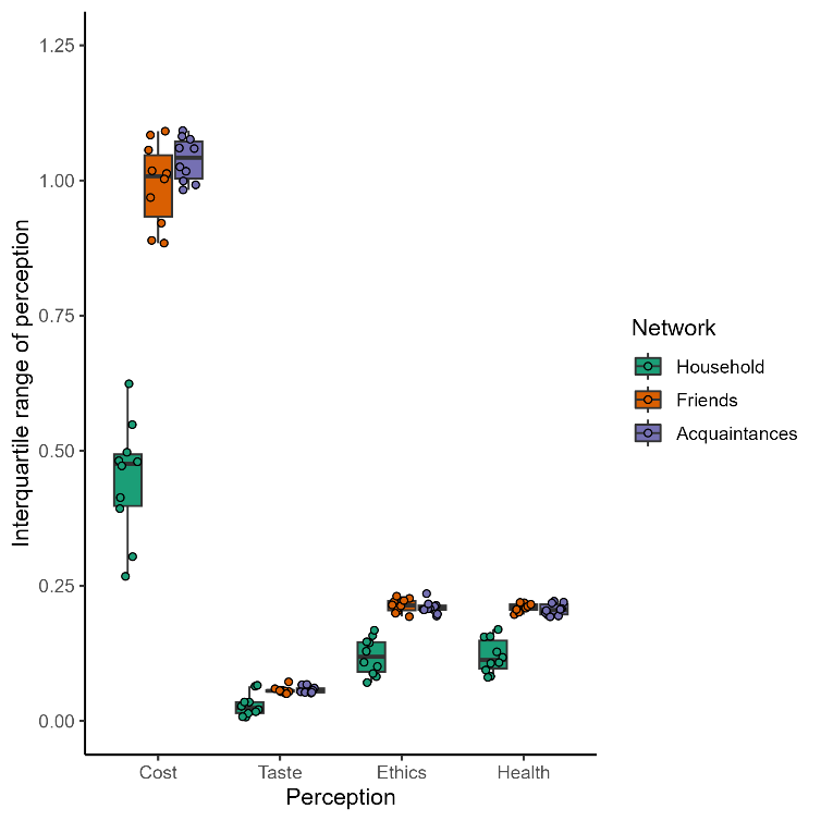 Stochasticity is present in the model at initialization, dietary decision-making, interaction, and updates to taste preferences. First, at initialization, consumers are assigned a household size, income, motivations, and perceptions based on distributions and ranges from empirical data (see ‘initialization’ below). Therefore, the precise motivation assigned for each attribute to a given consumer is not fixed. Throughout the simulation, interaction itself is also stochastic, both in terms of occurrence and outcomes: consumers have a probability of interacting based on connection strength and demographic similarity, but there is no fixed threshold or other guarantee that any two consumers will interact in a timestep (apart from consumers who are part of the same household). Moreover, the consumers each have a probability of accepting or distancing themselves from the other’s perceptions, based on the similarity of their relevant motivations. Finally, there is a stochastic error term in the updating of consumer’s taste preferences of a diet they have tried in that timestep, to represent different experiences with cooking, context, and other aspects not modeled here that may influence taste.