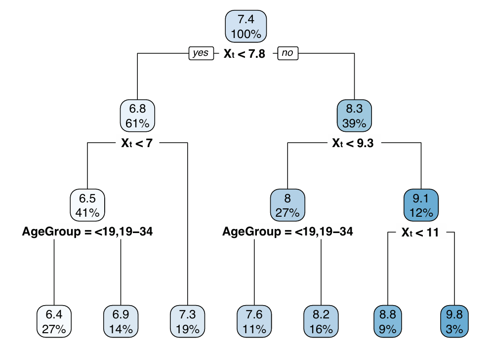 In part two, we projected medical expenditures from year to year conditional on a prediction of nonzero expenditures in part one. We first used a classification and regression tree (CART) to identify partitions of the population exhibiting meaningfully distinct medical spending patterns. Here, a “partition” refers to a group of records sharing a certain combination of predictor variables. We then defined a unique spending regression for each partition identified by the CART using a generalized linear model with an identity link function and the natural log-transform of health care expenditures. This type of approach (using machine learning to partition the dataset, then applying classical approximation schemes such as polynomial approximation or regression to the resulting partitions), has been proposed as an effective method for solving high-dimensional regression problems in general contexts (Fan et al. 2023).