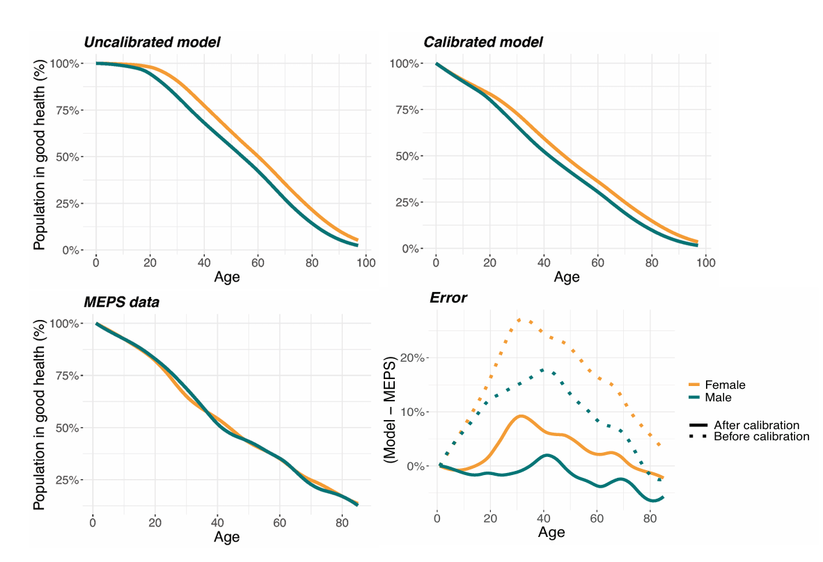 We assumed that individuals could be in a state of good health or poor health, with those in poor health suffering from either an acute condition (from which recovery is possible) or a chronic condition (from which recovery is not possible). To estimate the hazard rates for acute and chronic health conditions, we consulted the CDC and National Vital Statistics for cause of death data and obtained the proportions of deaths attributable to common health conditions (American Cancer Society 2019; Crimmins et al. 2008; Heron 2019; Murphy et al. 2018). We assumed that these rates also reflect the proportions of incidence rates by age and gender (we elaborate on the implications of these assumptions in Section 4). We used these hazard rates to represent the net transition from good to poor health. We then implemented a recovery rate from acute conditions that decreases with age, using a half-life that varies from 1 year at birth to 30 years at age 50.
