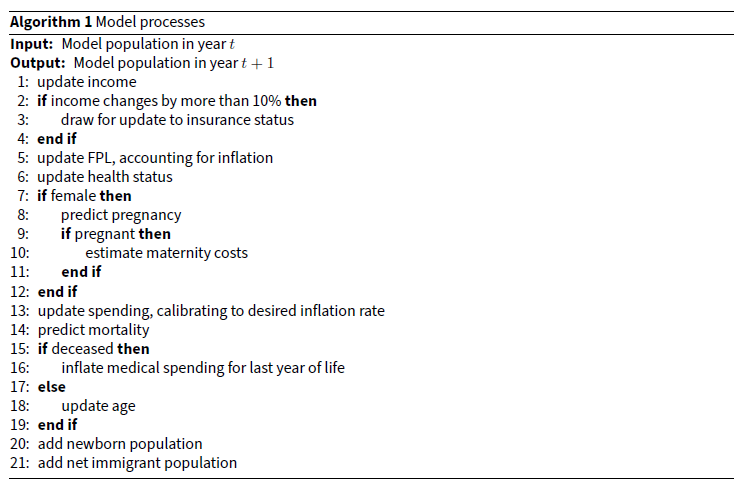 LHIEM is implemented as a set of sequentially executed processes, which we call “submodels”. Each of the attributes listed above, as well as medical spending itself, is evolved by a separate submodel. These are described in detail beginning in paragraph 2.12. Algorithm 1 outlines the processes that comprise LHIEM in the order they are executed.